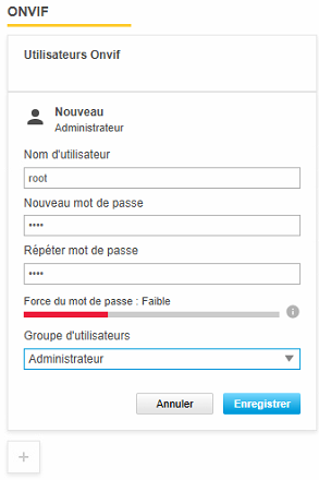 Ouvrir ONVIF, et ajouter l'utilisateur root (groupe administrateur) avec le même mot de passe